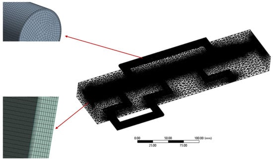 Meshing was performed using Ansys Mesh 2024 R2. Due to the symmetric design of the upper and lower parts of the 3D model, symmetry was employed in the simulation to simplify calculations. After a mesh independence test, the number of meshes in the computational domain was approximately 3.9 million. The minimum orthogonal quality of the meshes was 0.39, with over 90% exceeding 0.5, indicating that the mesh quality met the requirements. Furthermore, to ensure accurate calculation of the flow process, hexahedral meshes were used for the molten protein fluid region and cooling water channels, with boundary layers added (5 layers in total). The meshing of the cooling die is shown in Figure 3.