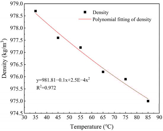 Figure 4 shows the density variation of PPI paste with a moisture content of 60% in the temperature range from 35 °C to 85 °C, along with the corresponding quadratic polynomial fitting curve. The results indicate that as the temperature increases, the density of the system exhibits a nonlinear decreasing trend. Specifically, the density decreased from 978.72 kg/m3 at 35 °C to 975.16 kg/m3 at 85 °C, showing an overall reduction of about 0.36%. Under the conditions of higher moisture content (60%), the protein undergoes structural expansion and partial denaturation due to heat. This process forms a network with a looser structure. As a result, the molecular density decreases, and consequently, the overall density is reduced [28].