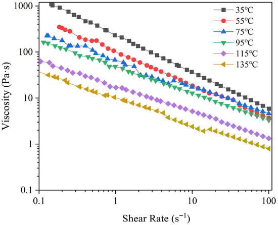 The relationship between the viscosity and shear rate of PPI paste with a moisture content of 60% at different temperatures (35 °C to 135 °C) is shown in Figure 5. The results indicate that under all temperature conditions, the apparent viscosity of the sample decreases significantly as the shear rate increases. This phenomenon exhibits typical shear-thinning behavior. It also shows characteristics of a pseudoplastic fluid [29,30]. In the low shear rate range (0.1–10 s−1), the viscosity decreases rapidly, while as the shear rate further increases (10–100 s−1), the viscosity change becomes more gradual. This behavior may be related to the dynamic equilibrium between the orientation and structural breakdown of the PPI molecular chains. On the other hand, temperature variation has a significant impact on the viscosity of PPI. At the same shear rate, the viscosity decreases as the temperature increases. For example, at 35 °C, the apparent viscosity of PPI ranges from 1104.17 Pa·s to 5.85 Pa·s as the shear rate increases from 0.1 s−1 to 100.0 s−1. At 135 °C, the apparent viscosity range drops to 38 Pa·s to 0.79 Pa·s. This suggests that high temperatures accelerate the weakening of intermolecular interactions in PPI, reducing the system’s flow resistance. This phenomenon is consistent with the findings of Jebalia et al. [31].