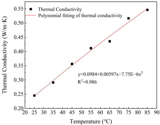 Figure 6 shows that the thermal conductivity of PPI increases nonlinearly with increasing temperature. This trend is consistent with the research by Elisabeth et al. [34] on the thermal conduction behavior of SPI. This nonlinear response can be attributed to the enhancement of hydrophobic cross-linking and molecular rearrangement during protein thermal denaturation. This enhancement, in turn, induces the formation of aggregates. It also widens the heat conduction pathways [35,36].