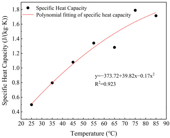 Figure 7 shows that the specific heat capacity increases continuously within the measured temperature range (20–120 °C). This indicates that the increase in temperature promotes the thermal motion of molecular segments. As a result, the system needs to absorb more energy to achieve the same temperature increment [37]. The protein-water interactions under high moisture conditions also enhance the thermal buffering capacity of the system, leading to a further increase in specific heat capacity [34].