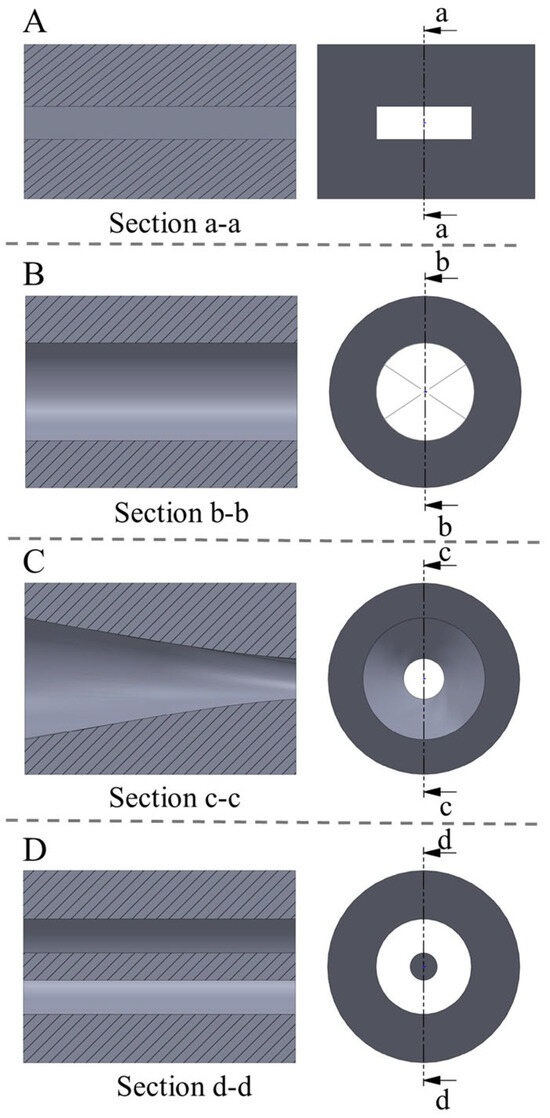 To ensure the geometric compatibility of the die with the twin-screw extruder system, the connection dimensions should be based on the barrel inner diameter design to ensure a proper fit. The outer diameter of the die body must be determined in conjunction with the die cross-sectional shape, such as rectangular, circular, or custom shapes. It needs to balance structural strength and heat dissipation performance. This avoids thermal deformation caused by a too-small diameter or material waste due to an excessively large diameter. The length of the die body should consider both cooling rate and pressure drop control. A length that is too short is detrimental to fiber structure formation. Conversely, a length that is too long increases flow resistance [42]. Four die mouth shapes were designed, as shown in Figure 8.