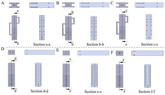 Schematic diagram of serpentine-shaped dual-channel and parallel linear cooling dies. (A) rectangular cross-section, (B) circular cross-section, (C) square cross-section, (D) rectangular cross-section, (E) circular cross-section, and (F) square cross-section.