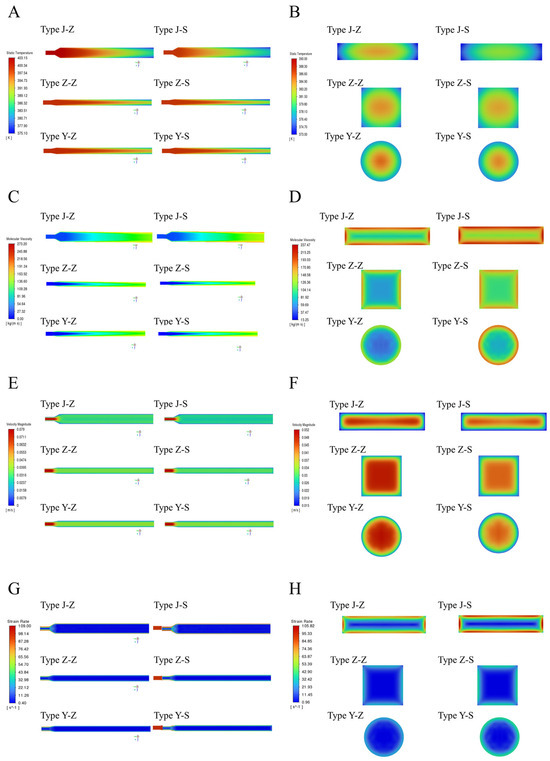 Simulation analysis of PPI flow characteristics under different cooling dies design schemes. (A) temperature distribution of flow channel cross-sections, (B) temperature distribution of outlet cross-sections, (C) viscosity distribution of flow channel cross-sections, (D) viscosity distribution of outlet cross-sections, (E) fluid velocity distribution of flow channel cross-sections, (F) fluid velocity distribution of outlet cross-sections, (G) fluid shear rate distribution of flow channel cross-sections, and (H) fluid shear rate distribution of outlet cross-sections.