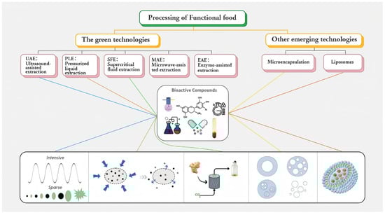 | Green extraction (UAE, MAE, EAE, PLE, SFE) | Obtains high-purity actives while lowering solvent, time and thermal damage | Ultrasound/microwave cavitation, enzyme hydrolysis, pressurized liquids, supercritical CO2 | Polyphenols, carotenoids, essential oils, peptides | Clean-label extracts for functional beverages, gummies, capsules | [123] |