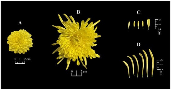 Morphological characteristics of fresh flowers in (A) Wuyuan Huangju (WYHJ) and (B) Jinsi Huangju (JSHJ), and the ligulate florets of (C) WYHJ and (D) JSHJ.