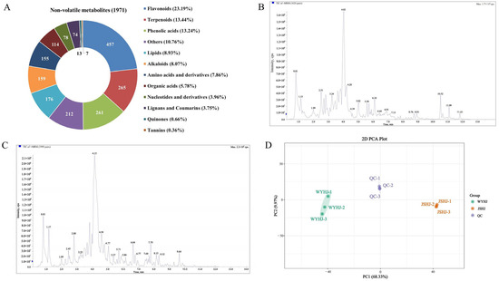 The two imperial chrysanthemum teas varieties, WYHJ and JSHJ, were investigated via a widely targeted metabolomics approach. Altogether, 1971 non-volatile metabolites were identified, including 457 flavonoids, 265 terpenoids, 261 phenolic acids, 176 lipids, 159 alkaloids, 155 amino acids, 114 organic acids, 78 nucleotides, 74 lignans and coumarins, 13 quinones, 7 tannins, and 212 other metabolites (e.g., saccharides, vitamins, and chromones) (Figure 2A and Table S1). To assess the method’s reliability, we prepared triplicate quality control (QC) samples. As shown in Figure 2B,C, the analysis of the overlap in the total ion current diagram of the QC samples in both the positive and negative ionization modes demonstrated great reproducibility. An unsupervised PCA model was used to monitor the data for both the QC and tested samples, depending on the 1971 non-volatiles obtained in the current research (Figure 2D). The two tea varieties were distinctly separated, and the QC samples were positioned at the centroids of all the specimens tested. This finding confirmed the dependability of the approach and also indicated that the two imperial chrysanthemum tea varieties contain different non-volatile compounds.