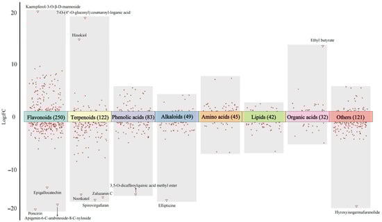 Reported, flavonoids, which possess anti-inflammatory and antioxidant activity, are important metabolites in C. morifolium flowers, and their levels in this flower are higher than those of other compounds [13,23,24,25]. However, individual chrysanthemum samples may differ significantly in terms of flavonoid quality and quantity [25,26]. In this study, 250 significantly different flavonoids were identified between the two imperial chrysanthemum tea varieties, including 116 flavones, 75 flavonols, 24 flavanones, 3 flavanonols, 16 isoflavones, 7 chalcones, 3 anthocyanidins, 3 flavanols, and 3 aurones (Table S2).