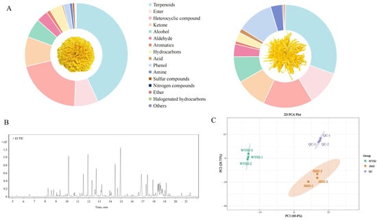 (A) Classes of volatile metabolites in imperial chrysanthemum teas. (B) Overlap analysis of the total ion current diagram for quality control (QC) samples. (C) Principal component analysis (PCA) plot of all test samples.