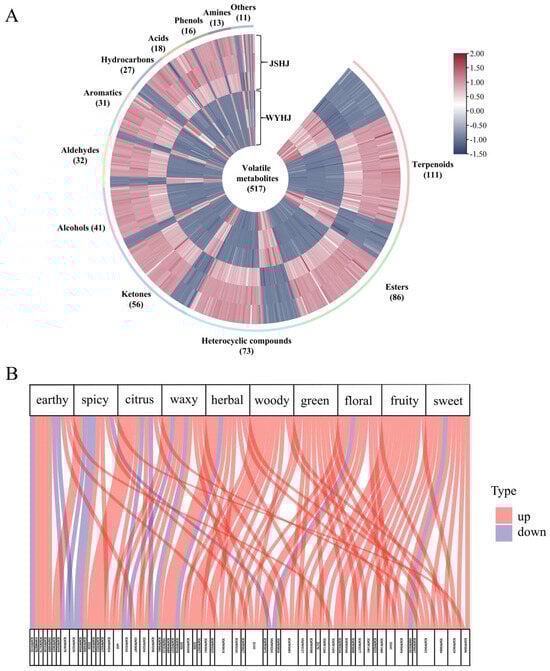 Using the same identification method as was used for the identification of differential non-volatiles, 517 differential volatiles, including 111 terpenoids, 86 esters, 73 heterocyclic compounds, 56 ketones, 41 alcohols, 32 aldehydes, 31 aromatics, 27 hydrocarbons, 18 acids, 16 phenols, 13 amines, and 11 others, were identified (Figure 5A and Table S4). In total, 145 and 372 volatile metabolites were upregulated in WYHJ and JSHJ, respectively.