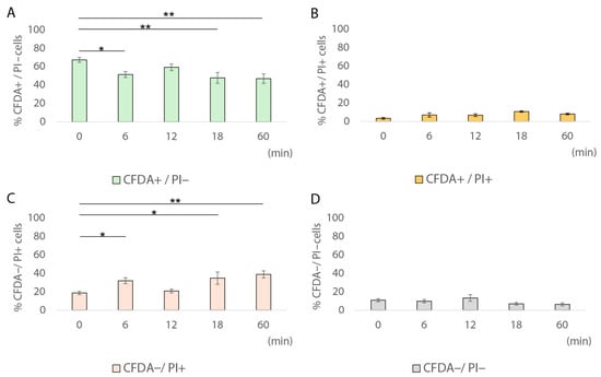 3.3. Transition of Metabolically Active Cells (CFDA+/PI−) to Sublethally Injured Cells (CFDA+/PI+) at Single-Cell Level