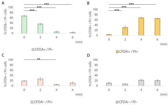 | Temperature | Exposure Time (min) | FC CFDA+/PI− | FC CFDA−/PI+ | FC CFDA+/PI+ | FC CFDA−/PI− |