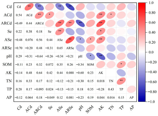Correlation analysis of Cd, ACd, and soil indicators. Note: * p ≤ 0.05, ** p ≤ 0.01.