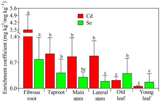 Enrichment coefficients of Cd and Se in tea tree organs. Note: Different letters within the same color group indicate statistically significant differences at the 5% level.