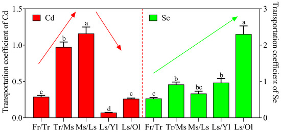 Transportation coefficient of Cd and Se in various organs of tea trees. Note: Fr, Fibrous roots; Tr, Taproots; Ms, Main stems; Ls, Lateral stems; Ol, Old leaves; Yl, Young leaves. Different letters indicate significant differences at p < 0.05. Arrows indicate upward or downward trends.