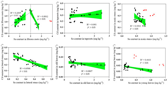 Regression Analysis of Cd and Se Content in Various Organs of the Tea Tree. Note: The green areas represent the 95% confidence intervals. The red “abnormal sampling points” were not taken into account in the regression analysis.