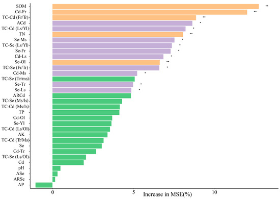 Random Forest Analysis of the Effects of Various Soil–Tea System Indices on Cd Content in Young Leaves. Note: Fr, Fibrous roots; Tr, Taproots; Ms, Main stems; Ls, Lateral stems; Ol, Old leaves; Yl, Young leaves. * p < 0.05; ** p < 0.01.