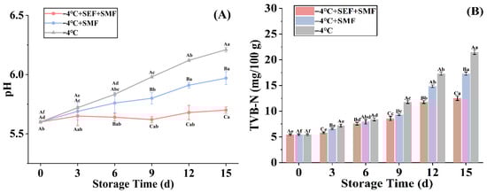 The pH value significantly influences the color, tenderness, flavor, and shelf life of beef, making it a frequently used indicator for assessing the quality of meat products. Fresh beef typically has a pH range from 5.50 to 5.80 and gradually increases with storage medium—quality meat falls within the range of 5.80–6.09, and stale beef has a pH exceeding 6.10 [29,30]. On the first day of the experiment, the pH of the beef was measured as 5.60, within the acceptable range for fresh beef. It is evident from Figure 3A that as time went by, the pH values in the three treatment groups showed an upward trend, this is attributed to microorganisms breaking down the beef protein during storage, releasing alkaline nitrogen-containing chemicals such as ammonia and other biogenic amines that can cause a persistent rise in pH [31]. The −4 °C + SEF + SMF and −4 °C + SMF groups were 5.70 and 5.97 on the 15th day, respectively. In comparison to the beef on day 0, which satisfies the requirements for fresh beef, the pH value of the beef at −4 °C + SEF + SMF did not vary substantially. While low temperatures effectively inhibit metabolic enzyme activity and bacterial growth, thereby slowing pH rise, the combination of electric [32] and magnetic fields [33] with low temperatures was shown to enhance this effect. In this experiment, compared with low temperature and magnetic field, the combined effect of low temperature and electromagnetic field more effectively suppressed the pH value change of beef. By the fifteenth day, this combined approach successfully maintained the pH of the beef within the fresh range by simultaneously using electric and magnetic fields.