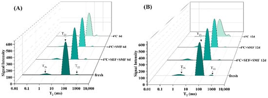 Figure 5C displays the peak area ratios of the three water populations. The peak area ratios in the −4 °C + SEF + SMF and −4 °C + SMF treatment groups show significant differences on the third day. This is partially because of the absence of ice crystals [66] and partly on the ability of SEF and SMF to prevent water from migrating to free water [67]; the combined use can enhance the inhibition of immobilized water migration to free water. A pattern of an initial decline followed by an increase in P22 was observed across all three groups, with the most pronounced trend occurring in the −4 °C treatment group. This phenomenon may result from the formation of ice crystals during low-temperature storage, which punctures the muscle fiber cells of beef and converts immobilized water within the cells to free water during thawing. In later stages of storage, the bacterial activity and other factors further compromise the structural integrity of the beef muscle fibers, leading to the migration of bound water to immobilized water. The reduced ability of the muscle fibers to retain immobilized water causes further migration to fixed water, thereby increasing P22.
