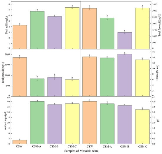 Basic physicochemical indices of Cabernet Sauvignon wine and Cabernet Sauvignon Musalais under different pretreatments. Notes: Cabernet Sauvignon wine (CSW) fermented at 28 °C; Cabernet Sauvignon Musalais (CSM-A, CSM-B, and CSM-C) fermented at 22 °C, 25 °C, and 28 °C, respectively. Different lowercase letters indicate that there are statistically significant differences in total acidity, residual sugar content, pH value, ethanol, total phenol content, and total flavonoid content among different treatment groups.