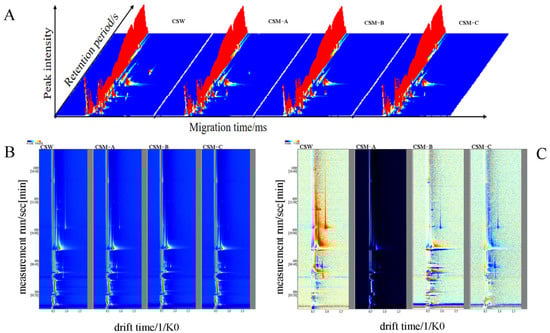 Three-dimensional GC-IMS spectra (A), two-dimensional GC-IMS spectra (B), and differential GC-IMS spectra (C) of volatile substances in CSW group and CSM-A, CSM-B, and CSM-C samples under different pretreatments.