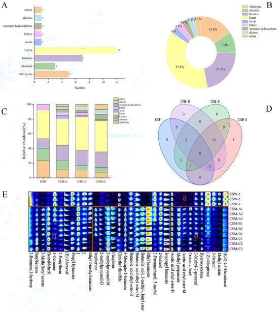 Characteristics of volatile compounds in CSW and CSM-A, CSM-B, CSM-C: number (A) and percentage (B) of volatile compounds, proportion of volatile compounds (C), Venn diagram (D), and fingerprint spectrum (E).