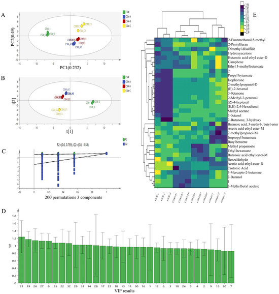 PCA analysis (A), PLS-DA score plot (B), confidence test results (C), VIP value distribution of volatile substances (D), and cluster heatmap analysis (E).