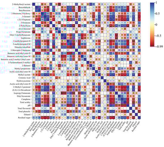 Blue indicates a positive correlation, red indicates a negative correlation, and points represent the correlation, with larger points indicating stronger correlation (Figure 6) [23] (Jiang et al., 2024). Alcohol content was positively correlated with Ethyl 3-methylbutanoate and Isophorone, and negatively correlated with total flavonoid 2-Furanmethanol, 5-methyl, but showed weak correlation with other volatile compounds. Residual sugar was significantly positively correlated with 2-Methylbutyl acetate, Benzaldehyde, butylbenzene, 2-Methylpropanol-D, Acetic acid ethyl ester-M, total acidity, and pH, while significantly negatively correlated with 2-Butanone, 3-hydroxy, 3-Octanol, (Z)-4-heptenal, propyl bytanoate, dimethyl disulfide, methyl acetate, pH, and total phenolic. Total phenolic was significantly positively correlated with 3-Octanol, (Z)-4-heptenal, 2-Butanone, 3-hydroxy, butanoic acid ethyl ester-D, methyl propanoate, methyl acetate, and 2-Methyl-2-pentenal, and significantly negatively correlated with benzaldehyde, butylbenzene, 3-octanone, ethyl hexanoate, 3-mercapto-2-butanone, and 2-pentylfuran. Total acidity was significantly positively correlated with propyl bytanoate, 2-Furanmethanol, 5-methyl, and hydroxyacetone, and significantly negatively correlated with 2-Methylbutyl acetate, 3-octanone, 3-mercapto-2-butanone, 2-butanol, and acetic acid ethyl ester-D. pH was significantly positively correlated with 2-Butanone, 3-hydroxy, 3-Octanol, (Z)-4-heptenal, and ethyl 3-methylbutanoate, and significantly negatively correlated with benzaldehyde, butylbenzene, butanoic acid, 3-methyl-butyl ester, and isopropyl butanoate. Total acidity was significantly negatively correlated with 2-Butanone, 3-hydroxy, 3-Octanol, (Z)-4-heptenal, methyl propanoate, and 2-Methyl-2-pentenal. Residual sugar and total acidity were positively correlated with 3-mercapto-2-butanone, thereby promoting the rapid formation of caramel flavor. Additionally, different basic indices such as residual sugar and total acidity exhibited distinct effects on the flavor of CSW. Combined with Figure 2, CSM under different processes and fermentation temperatures showed differences in basic physicochemical indices, indicating that the formation of flavor substances is closely related to the different treatment methods of CSM.
