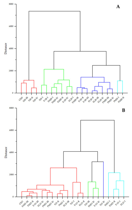 Hierarchical cluster analysis (HCA) of Cabernet Sauvignon wine and samples obtained during 12 months of ageing in different vessels. Abbreviations: CS20 and CS21—initial 2020 (A) and 2021 (B) vintage wines; S—stainless steel tank; EM—wooden barrel with excellent medium toasting; E+—wooden barrel with excellent medium plus toasting; EL—wooden barrel with excellent medium long toasting; PM—wooden barrel with premium medium toasting; I, II, III, IV—sampling after 3, 6, 9, and 12 months of ageing, respectively.