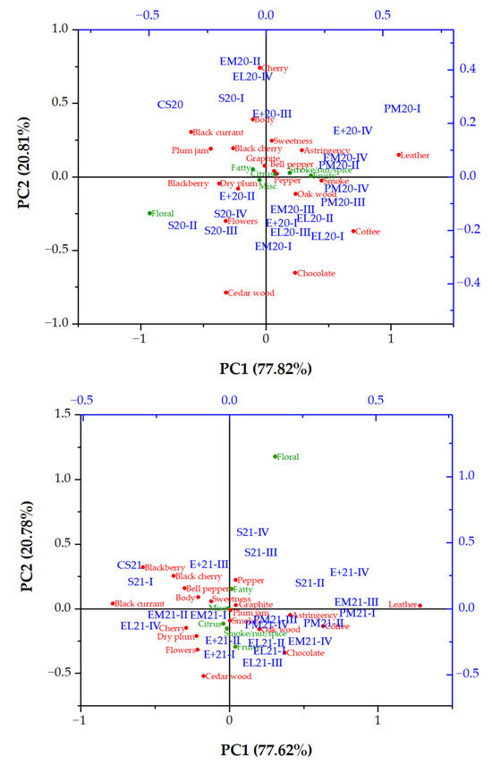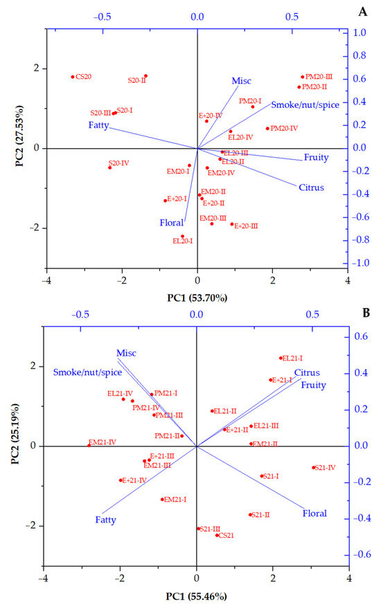 Principal component analysis (PCA) of Cabernet Sauvignon wine and samples obtained during 12 months of ageing in different vessels. Abbreviations: Misc.—miscellaneous (vinegar, caramel, and sulphurous); CS20 and CS21—initial 2020 (A) and 2021 (B) vintage wines; S—stainless steel tank; EM—wooden barrel with excellent medium toasting; E+—wooden barrel with excellent medium plus toasting; EL—wooden barrel with excellent medium long toasting; PM—wooden barrel with premium medium toasting; I, II, III, IV—sampling after 3, 6, 9, and 12 months of ageing, respectively.
