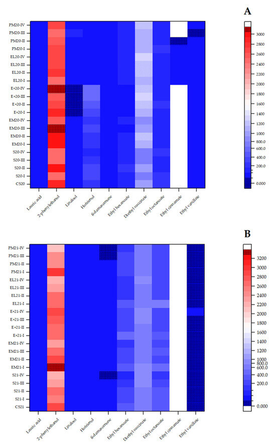 Heatmaps of the 10 key aroma compounds in Cabernet Sauvignon wine and samples obtained during 12 months of ageing in different vessels. Abbreviations: CS20 and CS21—initial 2020 (A) and 2021 (B) vintage wines; S—stainless steel tank; EM—wooden barrel with excellent medium toasting; E+—wooden barrel with excellent medium plus toasting; EL—wooden barrel with excellent medium long toasting; PM—wooden barrel with premium medium toasting; I, II, III, IV—sampling after 3, 6, 9, and 12 months of ageing, respectively.