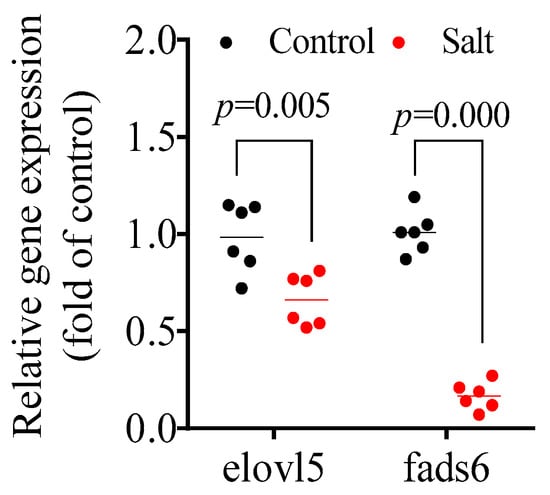 The fatty acid composition is shown in Table 2. Specifically, the contents of C16:0, C18:1n-7, C20:3n-6, C20:5n-3, and C22:6n-3 decreased in the salt-tolerant population compared to the control population. Nevertheless, the inverse results were observed for the C14:0, C16:1n-7, C18:1n-9, C18:2n-6, and C18:3n-3 contents. No obvious differences were observed for C18:0, C18:3n-6 (not detected), C20:4n-6, and C22:4n-6. Based on the fatty acid classification, the salt-tolerant population had a higher monounsaturated fatty acid (MUFA) content, but lower contents of saturated fatty acid (SFA), polyunsaturated fatty acid/long-chain polyunsaturated fatty acid (PUFA/LC-PUFA), docosahexaenoic acid (DHA), and eicosapentaenoic acid (EPA). Muscular genes involved in EPA and DHA synthesis, including fatty acid elongase 5 (elovl5) and fatty acid desaturase 6 (fads6), were also measured. The data showed that these two genes were notably downregulated in the salt-tolerant population compared to the control population (Figure 1).