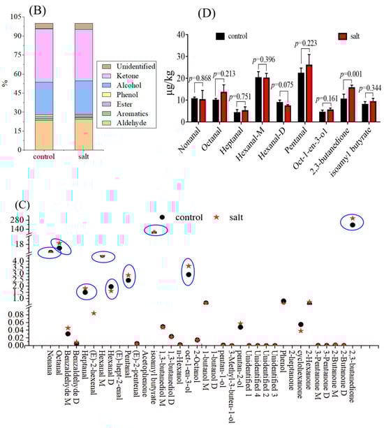A total of 36 volatile compounds, grouped into seven categories, were detected (Table 4). In general, volatile compounds were distributed differently between the two populations based on their fingerprint (Figure 2A). Of these categories, ketones were the most abundant, followed by alcohols and aldehydes, and the 3-Pentanone (monomer and dimer) content was the highest among these compounds in both populations (Figure 2B; Table 4). There were nine volatile compounds with OAV ≥1 in both populations, including nonanal, octanal, heptanal, hexanal-M, hexanal-D, Oct-1-en-3-ol, pentanal, 2,3-butanedione, and isoamyl butyrate (Figure 2C). However, only the 2,3-butanedione content differed between the two populations, and it was higher in the salt-tolerant population (Figure 2D).