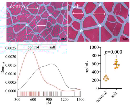 The flesh texture parameters are displayed in Figure 3. The muscular hardness, stickiness, chewiness, resilience, and cooking loss increased in the salt-tolerant population. However, the gumminess, springiness, and cohesiveness remained stable. The collagen content of the flesh is exhibited in Figure 4. These data indicated that flesh collagen content was markedly increased in the salt-tolerant population. Moreover, the morphology showed an increased space between myocytes and a decreased cell diameter in this population (Figure 4).