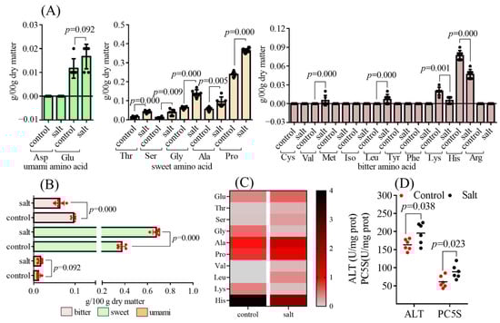 A total of seventeen free amino acids were analyzed, of which aspartic acid (Asp), cysteine (Cys), methionine (Met), isoleucine (Iso), tyrosine (Tyr), phenylalanine (Phe), and arginine (Arg) were not detected because of their low content outside the detection threshold (Figure 5A). Based on the classification, bitter amino acid content was obviously decreased in the salt-tolerant population, and the opposite result was observed for sweet amino acid contents. The two populations had similar umami amino acid contents (Figure 5B). In addition, ten free amino acids with a TAV > 1 were noted, including Glu, threonine (Thr), serine (Ser), glycine (Gly), alanine (Ala), proline (Pro), valine (Val), leucine (Leu), lysine (Lys), and histidine (His) (Figure 5C). The TAV of the free amino acid is listed in Supplementary Table S3. The salt-tolerant population had higher Thr, Ser, Gly, Ala, Pro, Val, and Leu contents than the control population, and the opposite results were observed for Lys and His contents. No obvious differences were found in Glu contents between the two populations (Figure 5A). Collectively, Ala, Pro, and His were the main amino acids responsible for flavor presentation based on the TAV results (Figure 5C). Except for His, which is an essential amino acid in fish, key enzyme activities that influenced Ala and Pro synthesis were detected. As excepted, the muscular ALT and PC5S activities were enhanced in the salt-tolerant population compared to those in the control group (Figure 5D).