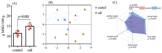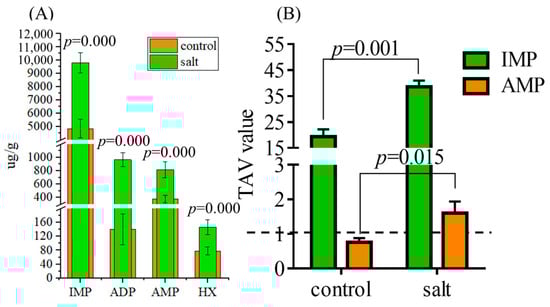 Figure 6 shows the flavor nucleotide contents in both populations, including inositol phosphate (IMP), adenosine diphosphate (ADP), adenosine monophosphate (AMP), and hypoxanthine (HX). The contents of the four flavor nucleotides were higher in the salt-tolerant population than in the control group (Figure 6A). In addition, IMP and AMP demonstrated TAVs >1, and higher TAVs were observed in the salt-tolerant population (Figure 6B).