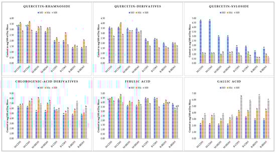 The rate and the significance of changes in the phenolic compounds presented in Figure 2 showed non-similar patterns during the cold storage at the two selected relative humidity levels. For the “Quercetin-Rhamnoside”, a general increase was observed (significant or not, depending on the cultivar, prior drying treatment, and relative humidity) in the content of this phenolic compound after four months of storage before regaining approximately the initial concentration at M8. This general trend was recorded for all treatments besides the infrared-dried ‘Mejhoul’ stored at 55% or 65% of RH. The content of “Quercetin-derivatives” showed a significant decrease between the beginning (M0) and the end of storage (M8) for all treatments with the exception of “M-IRD55” and “M-IRD65”. For these two treatments, the amount of “Quercetin-derivatives” remained in the range of 3.01–3.42 g 100 g−1 DM without any significant changes (p > 0.05). For “Quercetin-Xyloside”, a significant decrease in the eight samples considered by this investigation was observed. Interestingly, Quercetin-Xyloside concentration decreased by about 400% between M0 and M4 for the case of convective dried ‘Mejhoul’ cultivar stored both at 55% and 65% of RH. The rate of decrease for ‘Mejhoul’ dried using infrared drying was about 300% between M0 and M4. Moreover, no significant changes were observed between M4 and M8 for this phenolic compound in the case of all ‘Mejhoul’ treatments. For the ‘Boufeggous’ cultivar, the rate of decrease in Quercetin-Xyloside was less pronounced compared to ‘Mejhoul’. Likewise, the concentration of “Chlorogenic-acid derivatives” (CAD) exhibited a progressive and significant increase during storage for all treatments besides date samples subjected to prior convective drying and stored at 55% of RH: “M-CD55” and “B-CD55”. For these two samples, no significant changes in CAD amount were recorded between M0, M4, and M8. For the “Ferulic acid”, no clear tendency could be pronounced among the majority of treatments. Nonetheless, convective dried ‘Boufeggous’ samples stored at both 55% and 65% of RH showed stable content of Ferulic acid between M0 and M4, before a significant degradation in the concentration of this phenolic acid between M4 and M8. The magnitude of degradation ranged from 4.41 to 3.72 and 3.35 g 100 g−1 DM for “B-CD55” and “B-CD65”, respectively. In the case of “Gallic acid”, a gradual and significant increase was observed in all date samples stored under the two RH conditions. The rate of increase was more evident in the case of ‘Boufeggous’ cultivars and especially between the 4th and the 8th month of cold storage. During this period of storage, the rate of increase was around 50%.