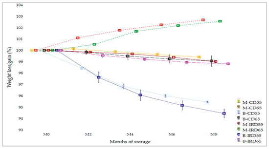 As expected, weight loss was related to the initial water activity of date cultivars and to the RH applied during storage. Thus, both convective and infrared ‘Boufeggous’ samples stored at the lower RH of 55% showed a significant decrease during storage, resulting in estimated losses of 5.6% and 4.5% at the end of storage for “B-IRD55” and “B-CD55” treatments, respectively. In contrast, a significant weight gain was observed for ‘Mejhoul’ stored at high RH of 65% reaching a final value of 102.5% and 102.7% for “M-CD65” and “M-IRD65” respectively. Accordingly, the weight losses generated for the four abovementioned treatments exhibited a potential impact of relative humidity applied during storage and also the initial water activity of each date cultivar (Table 1). Also, the rate of change was more pronounced in the first four months of storage (M0 to M4) compared to the last four months (M4 to M8). For the other four treatments (“B-IRD65”, “B-CD65”, “M-IRD55”, and “M-CD55”), a slight change was recorded for weight loss.