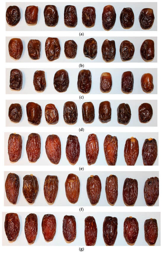 Images of date fruit (resulting from all considered treatments) were acquired using a Canon digital camera (Canon EOS 2000D, Ōta, Tokyo, Japan) with a Canon Zoom Lens EF-S 18–55 mm/Ø58 mm. After image acquisition, the background was changed to black. Additionally, image segmentation was carried out using Q-MAZDA 23.10 software in the objective to determine the regions of interest (Łódź University of Technology, Institute of Electronics, Łódź, Poland) [17,18]. Then, image features were extracted based on color, texture, and morphological features, allowing the obtention of 599 image features for each ROI.