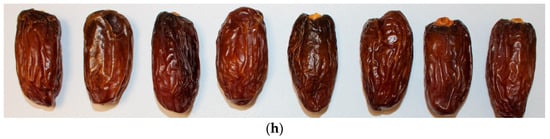Illustration of stored date fruit. (a): B-CD55; (b): B-CD65; (c): B-IRD55; (d): B-IRD65; (e): M-CD55; (f): M-CD65; (g): M-IRD55; (h): M-IRD65.