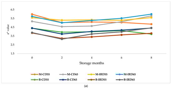 For b*, a stability in the value of this feature was observed between the beginning and the second month of storage. At that point, a slight and progressive increase in b* value was exhibited for all treatments until M8. This pattern was intense for the case of M-CD65 and M-IRD65, which showed a two-fold increase from 4.5 to 9 between M2 and M8. A similar pattern was indicated in the changes of BI as it was described for b*, demonstrating a progressive browning among all stored categories of date fruit. The higher ranges of variation in the browning index were observed for the case of M-CD65 and M-IRD65, which increased respectively from about 32 to 50 for M-CD65 and from 37 to 51 for the case of M-IRD65. Conversely, the smallest changes in BI were recorded for ‘Boufeggous’ cultivar stored at 55% of RH: “B-IRD55” and “B-CD55”. In the case of B-IRD55, the increase between M0 and M8 was significant, while no significant changes were exhibited in BI values during storage for B-CD55.