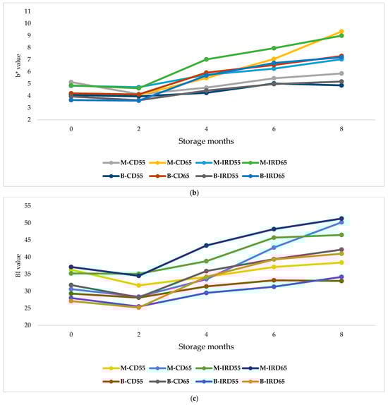 Patterns of color changes during cold storage. (a): a* value (red-green); (b): b* value (Yellow-Blue); and (c): BI value (Browning index).