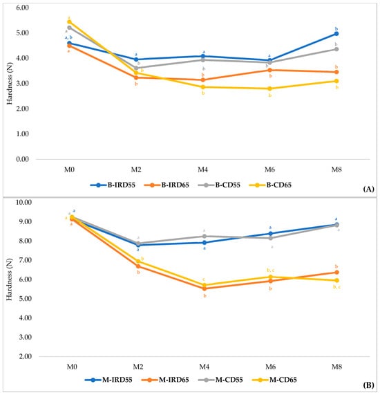 Evolution of Hardness during cold storage for ‘Boufeggous’ (A) and ‘Mejhoul’ (B) cultivars. For each curve, different letters refer to significant difference (among months of storage) by Tukey test (p < 0.05).