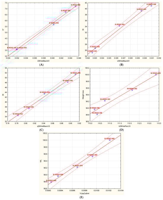 Scatter plots for: b* of B-IRD65 (A), BI of B-IRD65 (B), BI of M-IRD65 (C), weight loss of M-IRD65 (D), and weight loss of B-IRD65 (E) as correlated with accurate image features.