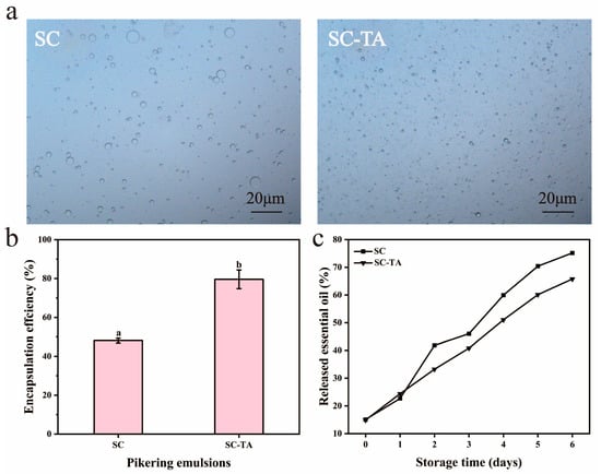 Figure 2b demonstrates significantly higher encapsulation efficiency (p < 0.05) for the TA-modified SC emulsion system (79.62 ± 4.77%) compared to the native SC-stabilized counterpart (48.13 ± 1.24%). The encapsulation efficiency serves as an indicator of emulsion stability, with higher values corresponding to greater stability [34]. The results demonstrate that TA modification enhanced BEO incorporation into the emulsion. This improvement may be attributed to the formation of a denser and more cohesive interfacial layer through SC–TA complexation, which enhances adsorption at the oil-water interface and reduces droplet coalescence. The improved interfacial film strength and stability imparted by SC-TA to the Pickering emulsion thus contribute to higher encapsulation efficiency.