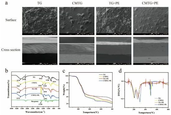 CMTG films demonstrated significant mechanical improvements compared to those of TG films (Table 3), with tensile strength (TS) increasing from 4.81 ± 0.81 MPa to 11.39 ± 0.29 MPa and elongation at break (EAB) rising from 19.22 ± 3.83% to 40.89 ± 11.57%, may attributable to newly established electrostatic interactions and hydrogen bonding networks (As illustrated in Figure 3b, the CMTG film exhibits an appreciable broadening of the ν (O–H) envelope spanning 3200–3600 cm−1, accompanied by a distinct red-shift relative to the native TG film.) [43]. The incorporation of PE had contrasting effects on the TS of TG and CMTG films, indicating that PE negatively impacted the tensile strength of TG films but improved that of CMTG films. This result further suggests the formation of chemical bonds, such as hydrogen bonds, between PE and CMTG, leading to a denser structure. However, the EAB of both TG and CMTG films decreased after the addition of PE, likely due to the transition from a continuous to an irregular film structure, which is consistent with the findings reported by Ming Cheng et al. [34].