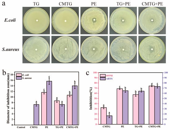 (a) Antimicrobial activity of the films. (b) The antibacterial zone of the films. (c) Antioxidant activity of the films. Different lowercase letters indicate significant difference (p < 0.05).