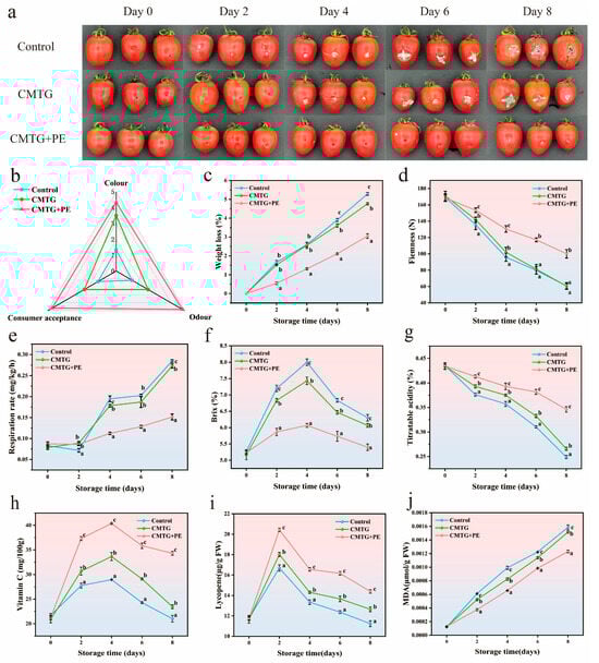 (a) The visual appearance of cherry tomatoes. (b) Sensory analysis of cherry tomatoes on the 8th day of storage. (c) Weight loss changes in cherry tomatoes. (d) Firmness changes in cherry tomatoes. (e) Respiration rate changes in cherry tomatoes. (f) TSS content changes in cherry tomatoes. (g) TA content changes in cherry tomatoes. (h) Changes in VC content in cherry tomatoes. (i) Changes in lycopene content in cherry tomatoes. (j) Changes in MDA content in cherry tomatoes. Different lowercase letters indicate significant difference (p < 0.05).