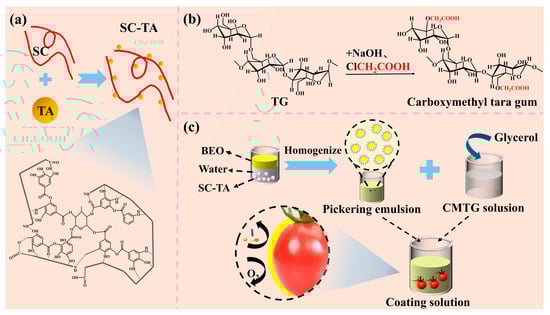 Material Preparation and Preservation Process Flow Diagram. (a) The schematic representation of the SC–TA nanocomposite structure. (b) The chemical structure of TG before and after its carboxymethylation. (c) The simple preparation flowchart of the coating solution.