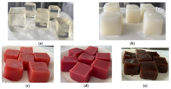The jellies: (a) CJ; (b) WhJ; (c) WhSJ; (d) WhRJ; and (e) WhBJ.